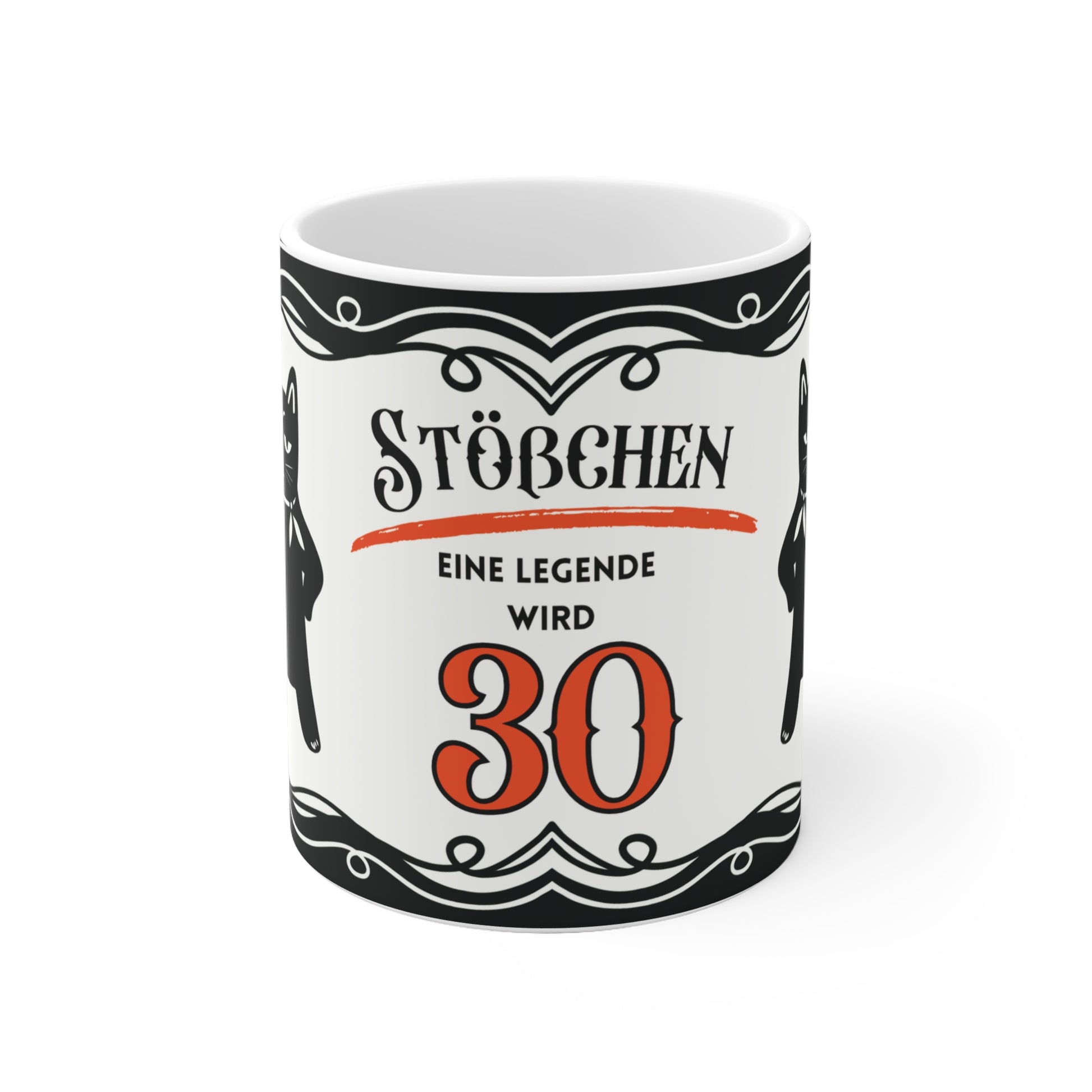 Diese lustige Geburtstagstasse zum 30. ist das perfekte Geschenk für Männer und Frauen mit Humor! Im Retro-Stil gestaltet zeigt sie eine schwarze Katze mit Prosecco, Geschenkbox und dem augenzwinkernden Schriftzug: „Eine Legende wird 30“.