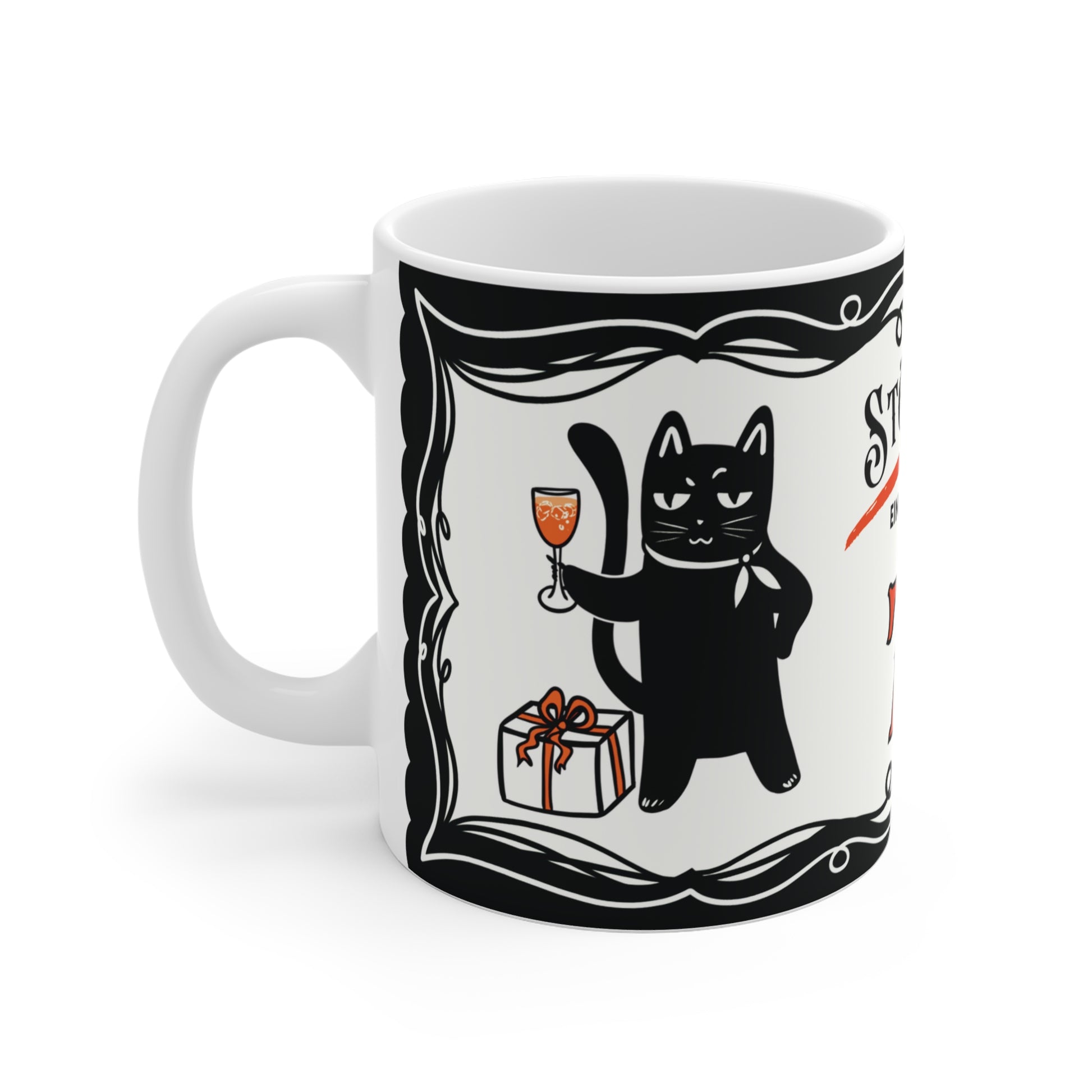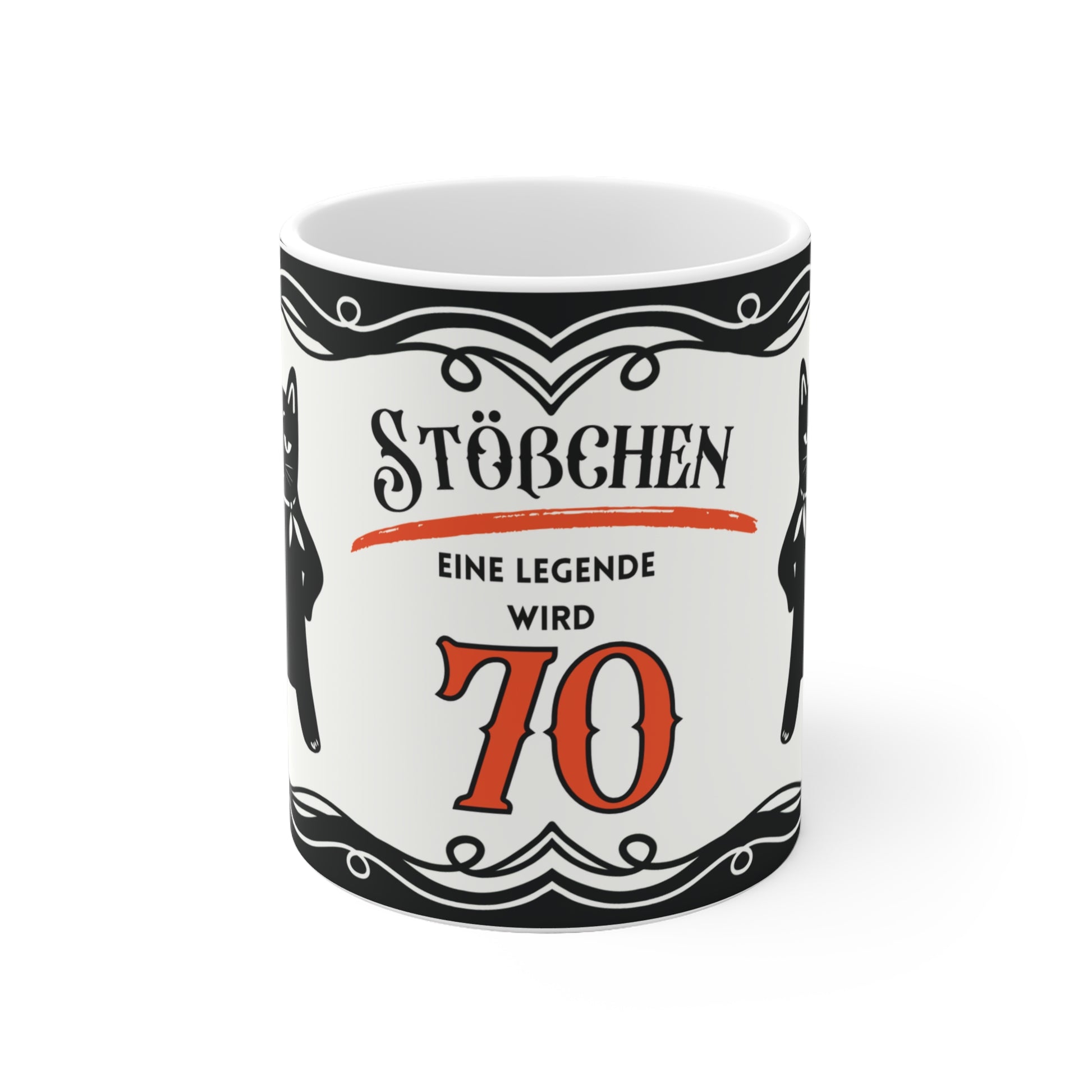 Diese lustige Geburtstagstasse zum 70. ist das perfekte Geschenk für Männer und Frauen mit Humor! Im Retro-Stil gestaltet zeigt sie eine schwarze Katze mit Prosecco, Geschenkbox und dem augenzwinkernden Schriftzug: „Stößchen Eine Legende wird 70“.