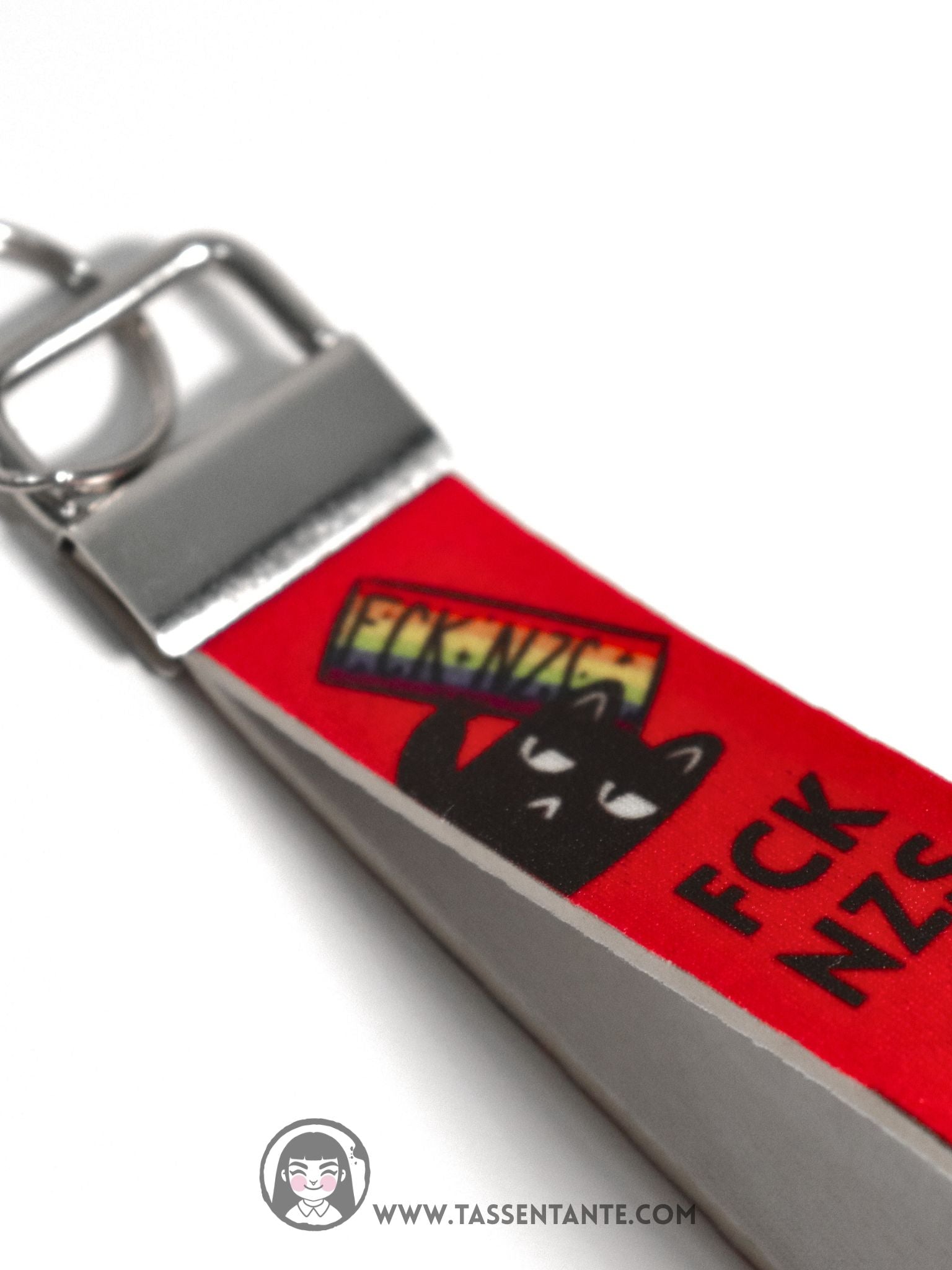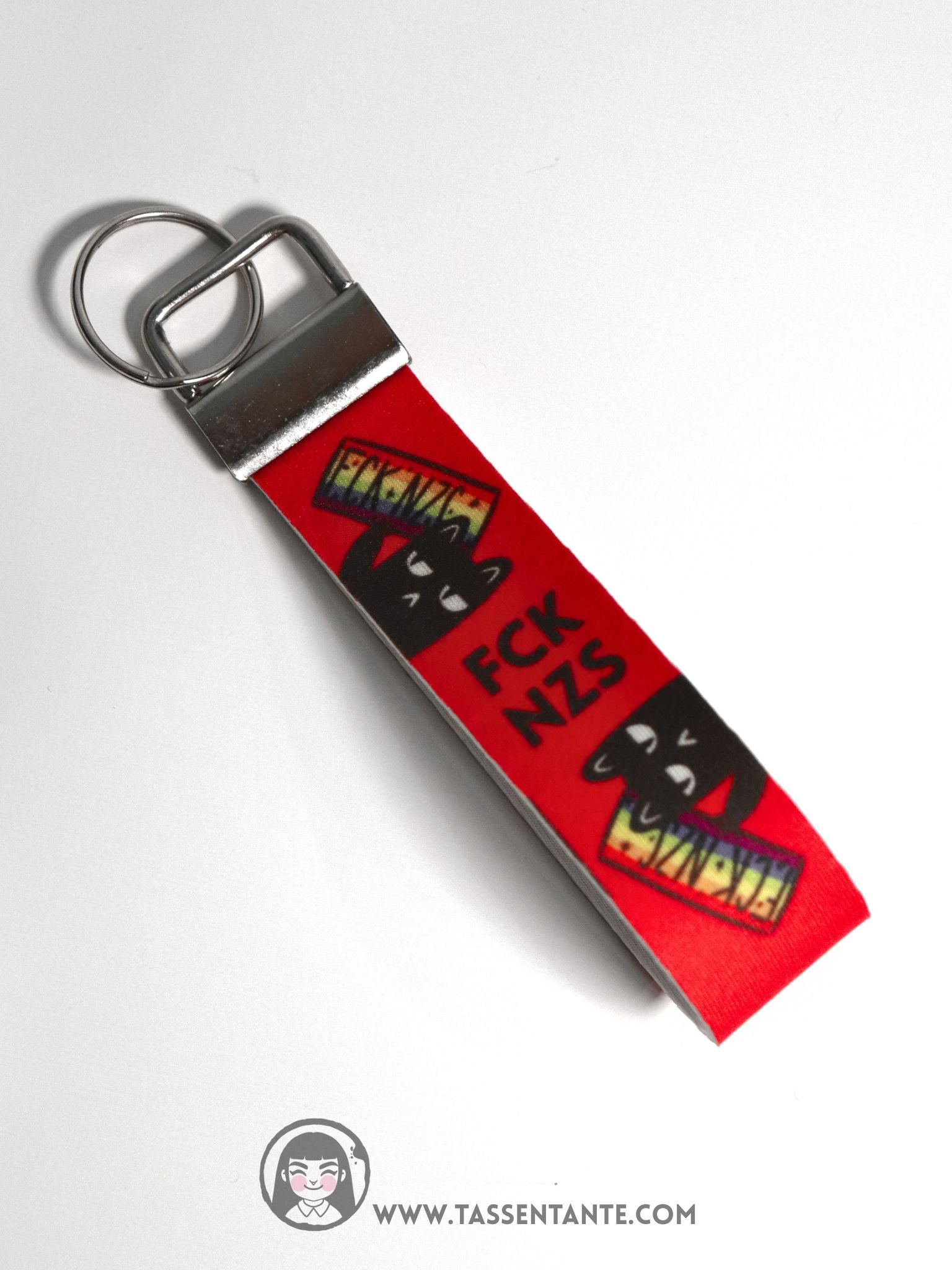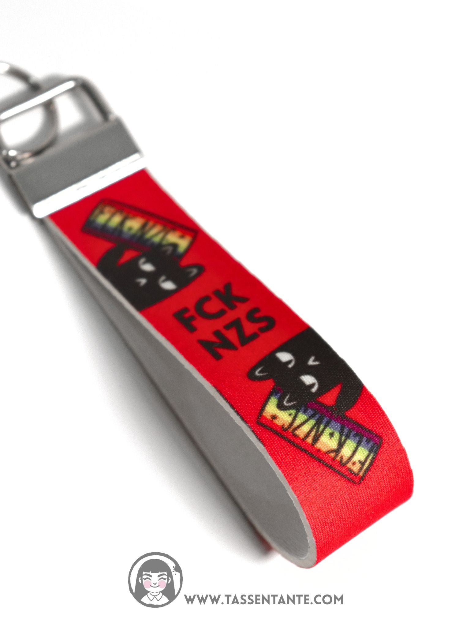 Auf dem Schlüsselanhänger ist Leopold abgebildet, der ein Pride Plakat hochhält mit dem Text FCK NZS. Das Motiv wechselt sich mit Typografie ab (FCK NZS). Die Grundfarbe des Anhängers ist rot.