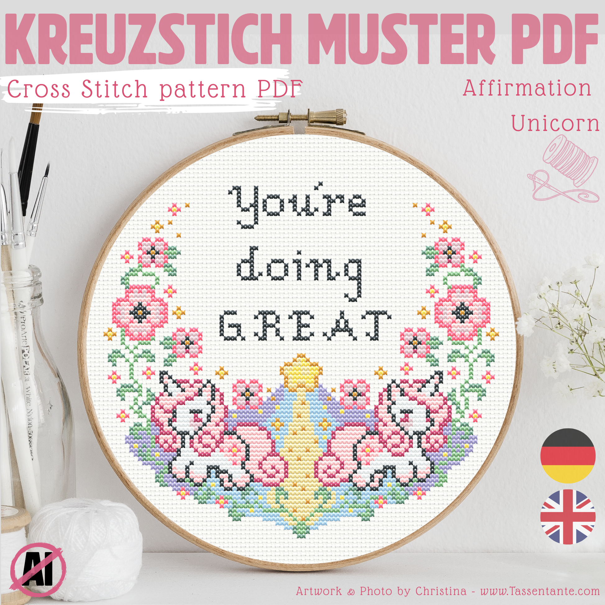 Stickvorlage Kreuzstich - Einhorn - Positive Affirmation - You´re doing Great